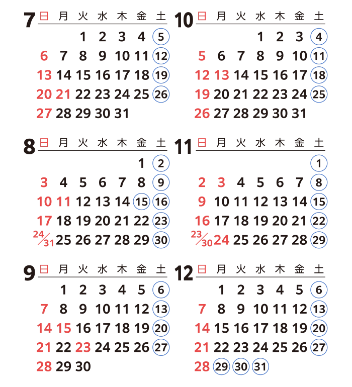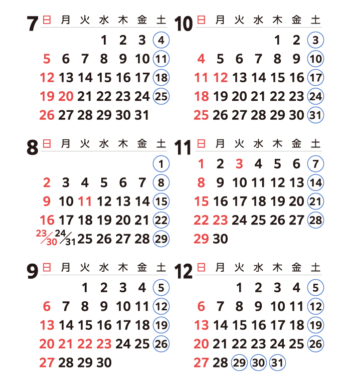 ※法律等の改正により、国民の祝日・休日等が変更となる場合があります。