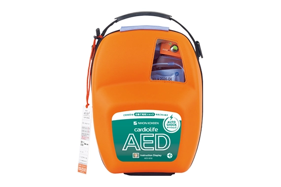けいれんして血液を流すポンプ機能を失った状態(心室細動)になった心臓に対して、電気ショックを与え、正常なリズム(拍動)に戻すための医療機器です。