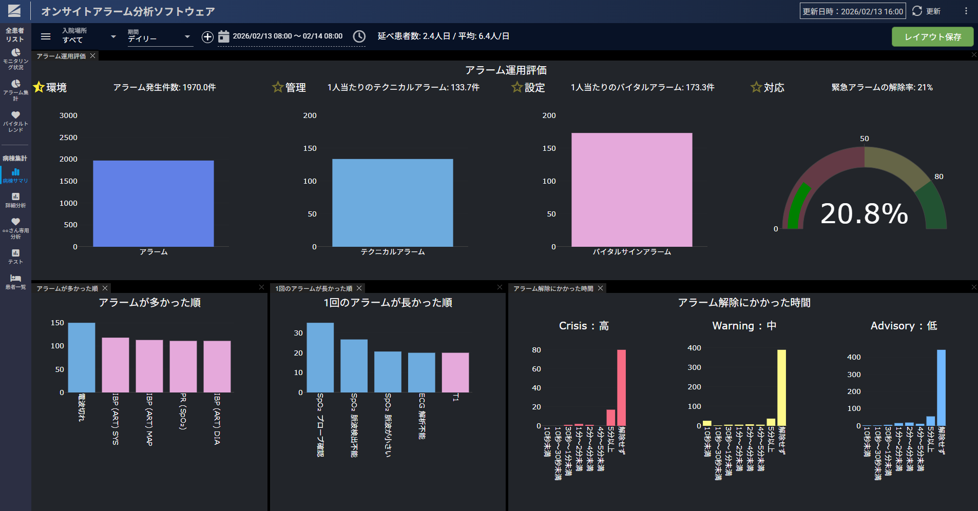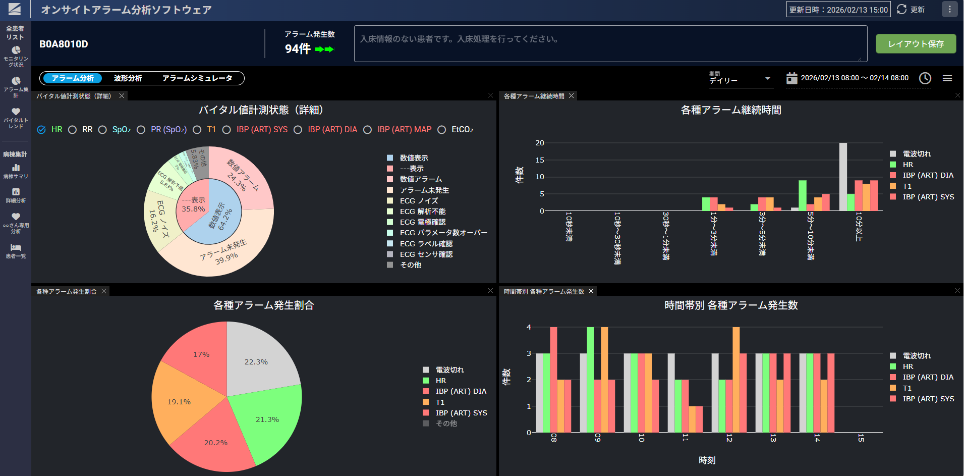 入床中の患者さんのモニタリング状況、アラーム発生状況をリアルタイムで確認可能。患者さんごとのアラーム発生状況や発生前後のバイタルサインや波形情報等もテキストやグラフで確認できることから、個別でアラーム対策が可能。利用状況に応じて、表示・分析する情報の選択・組み合わせが可能。