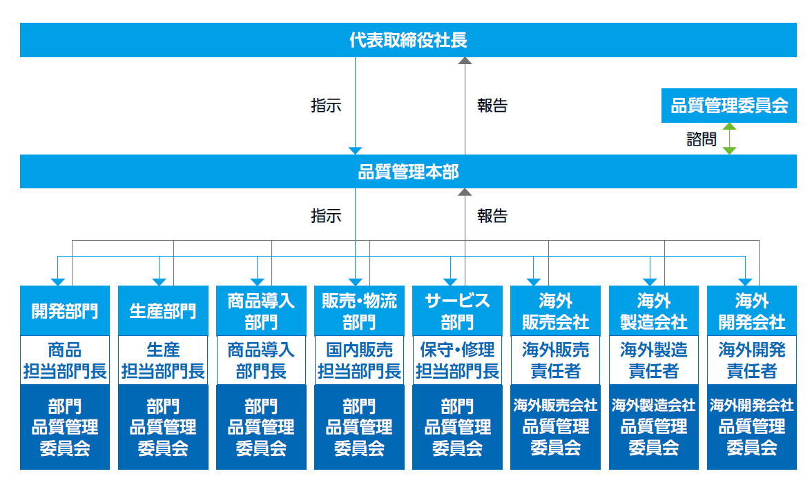 日本光電では、医療機器の設計、開発、製造、販売、保守、廃棄といった製品の全ライフサイクルにわたり、それぞれを分掌する体制を構築し、品質を監視しています。その結果を収集して品質システム管理責任者から社長に年3回報告することで、製品の品質リスクをゼロに維持することを目指して活動しています。