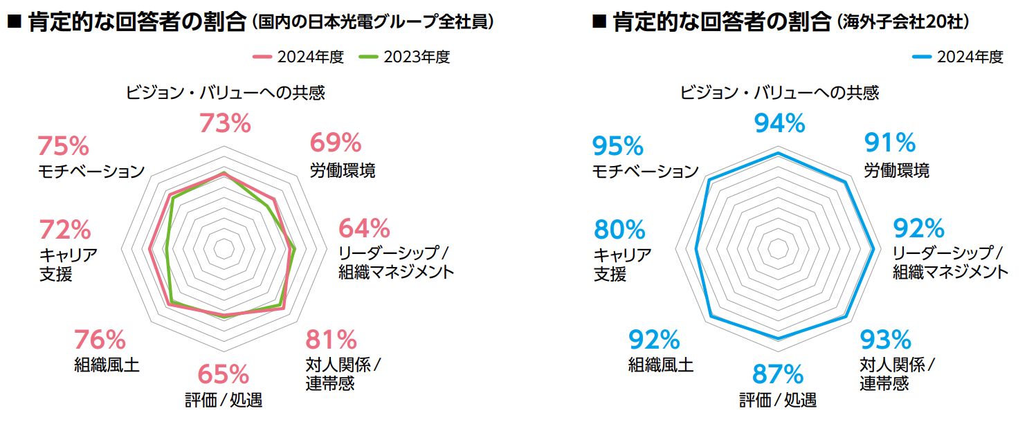 日本光電では、サステナビリティ重要課題(マテリアリティ)の1つである「医療への貢献にやりがいと誇りを持てる組織⾵⼟の醸成」に向けて、「従業員満足度」をKPIに設定しています。2024年度も、国内の日本光電グループ全社員約4,500名を対象に調査を実施しました。本調査は、全48項目を8つのカテゴリに分類し、肯定的な回答者の割合を算出しています。2023年度の結果を受け、社員の自律的なキャリア形成を支援する「NKキャリアサポート」の推進や、生産性の向上に向けた全社的な取り組みを実施した結果、「キャリア支援」、「労働環境」のカテゴリにおいて改善が見られました。さらに、2024年度は、海外子会社20社約1,000名を対象に、国内と同様の調査を初めて実施し、8つのカテゴリすべてにおいて高い満足度であることが確認できました。