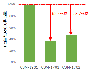 従来製品のCSM-1901と比較し、1台当たりのCO2排出量は、CSM-1701は62.3%減、CSM-1702は53.7%減