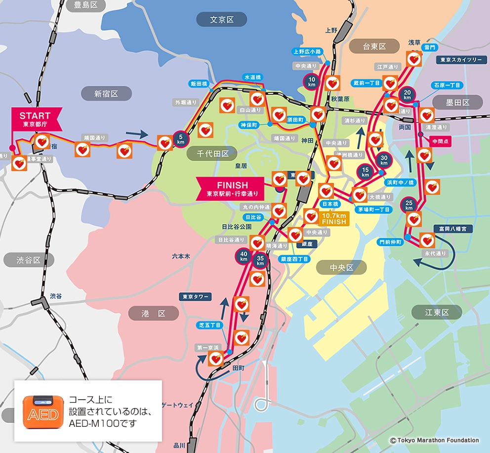 マラソン中に万一のことが起きたとき、1分1秒でも早く救命処置が行えるよう、各救護所にAEDを設置するほか、コース上にも大会の救護ボランティアが日本光電のAEDを持って待機します。